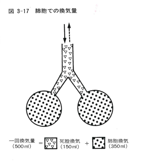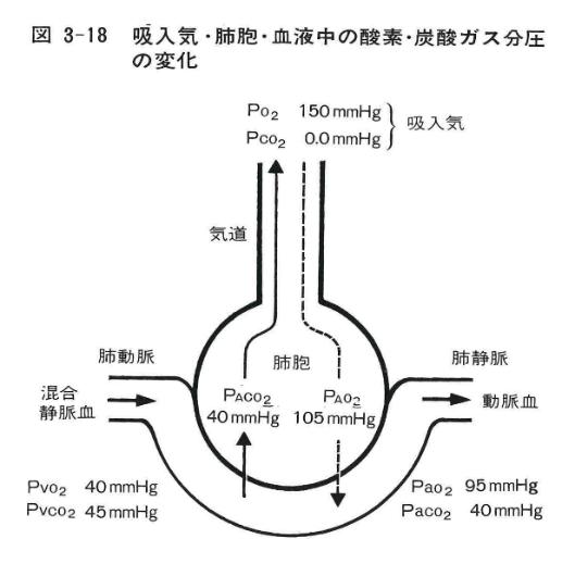 さらに詳しく説明しますと、吸気時に体内に取り込まれた空気は、動脈血となり体内の各組織へ運ばれます。酸素分圧は(Pao2 :95mmHg)で、パルスオキシメータはこれを表示したもので正常値は94vol.% 以上です。酸素は組織の新陳代謝には必要なO2ガスを毛細血管で放出し、組織で作られたCO2ガスを静脈側の毛細管に取り込み、静脈血として右心房に還ってきます。呼気時には肺胞でガス交換された換気量(350ml)となります。理由は500mlの空気を吸い込んでも実際には肋骨や胸郭があり、解剖学的にそれ以上、減少しないため、500ml-350ml=150mlとなり「死腔換気」と呼ばれます。炭酸ガス分圧は(Pvco2:40mmHg)となります。