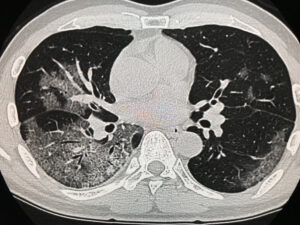 典型的な「COVID-19」のCTスキャン像…これは肺炎にかかった部分が、丁度「メロンの表皮」パターンの様になっているところから「Crazy paving pattern」と呼ばれているようです。