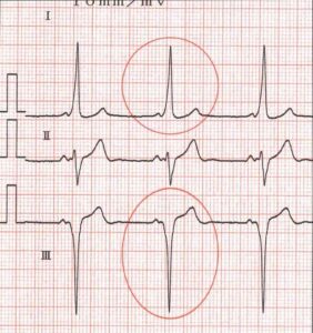 図1(a)の標準誘導(I,III)で示される様に、P波の直後からデルタ型に立ちあがるRS波は幅が広く0.12秒を越えています(1,000人に数人の確率で起こる「先天性心疾患」の1つです)。1920年代後半に、3人の医師:Wolff-Parkinson-Whiteが、偶々独自に患者の中に変わった心電図波形を示す人がいることを発見し、1930年共著で論文をまとめ「WPW症候群」として発表しました。当時はまだ心電図がまだ標準誘導しかなかった頃であり (主に10代∼20代に見られる先天性心疾患の1つですが、発作性頻脈や、動悸、胸痛、眩暈、吐き気、時には呼吸困難を起こし、意識が薄れることもありました。これは胎児時期に心臓には「ケント束」と呼ばれる刺激伝導路がありますが) 殆どの胎児は生後すぐこの房室短絡路が無くなってしまいます。しかし1,000人中、数人の確率でその刺激伝導系が残ってしまう人があることを発見したのです。正常の心臓では心房内の刺激は一旦「房室結節」に入り左右の心室脚へと刺激が伝わります。従って心房内の刺激が直接心室に伝わることはありません。