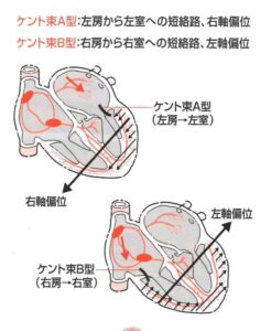 図1(b)で「ケント束」にはA型とB型があることを示しており、無症状に経過する人もありますが、多くは「発作性頻拍」(心房内へ刺激がリエントリーする結果、頻拍発作を起こす)を起こすのです。基本的には遺伝はしないと言われていますが、遺伝があったという事例も報告されています。最近では治療法としてカテーテル・アブレーションがあり、ケント束を焼却することで、2度と頻脈発作起こることを予防できるようになったことは言うまでもありません。